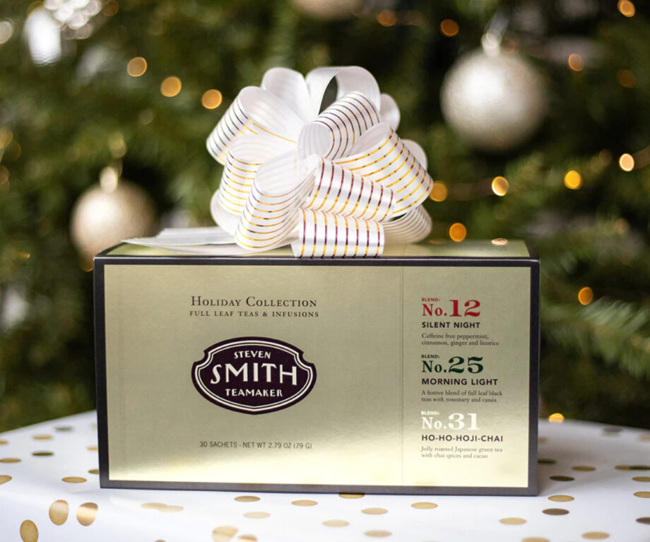 A delicious combination of Smith‘s three most spirited holiday teas to introduce you to their joyful flavors. An excellent gift and delicious counter decor for the holidays and beyond. Assortment features 30 biodegradable sachets with 10 of each holiday flavor including Morning Light black tea, Ho-Ho-Hoji-Chai roasted green tea and Silent Night herbal infusion. Here’s to the present moment. And the after-the-presents moment.