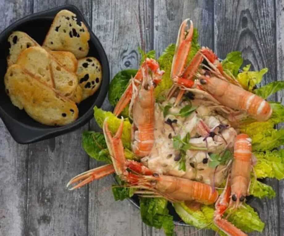 A luxurious shellfish cocktail with sweet pear, baby gem toasted sunflower seeds and sourdough crisps, courtesy of The Fish People. Enjoy this starter – intended for festive sharing – that’s just perfect for Christmas with a selection of delicious fish such as shrimp, crab, crayfish and king prawn bound in a marie rose sauce.