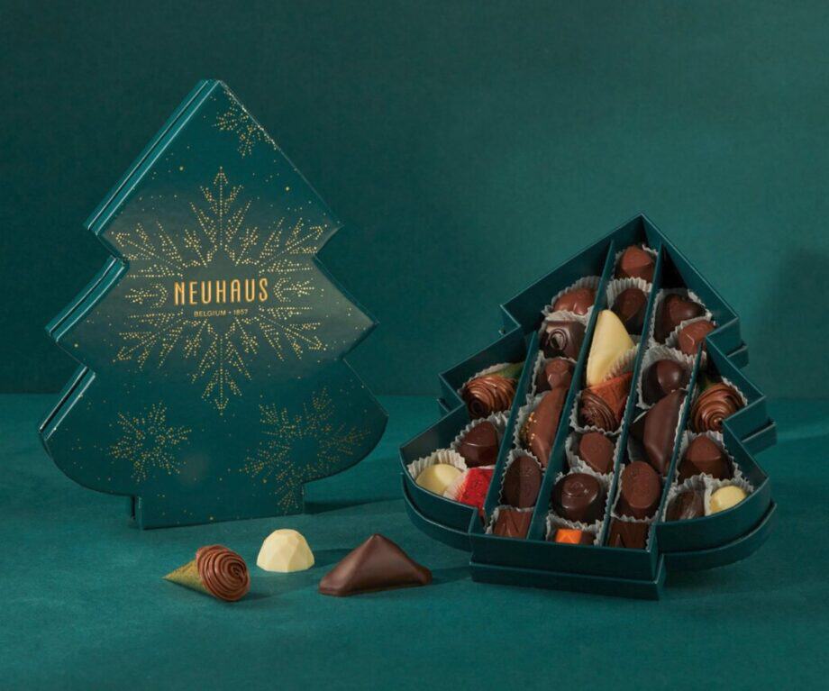 This 335g Christmas Tree Box contains an assortment of 27 timeless Neuhaus milk, dark and white filled chocolates. Wrapped in a festive green-and-gold Christmas tree box, it makes the perfect gift for chocolate lovers.