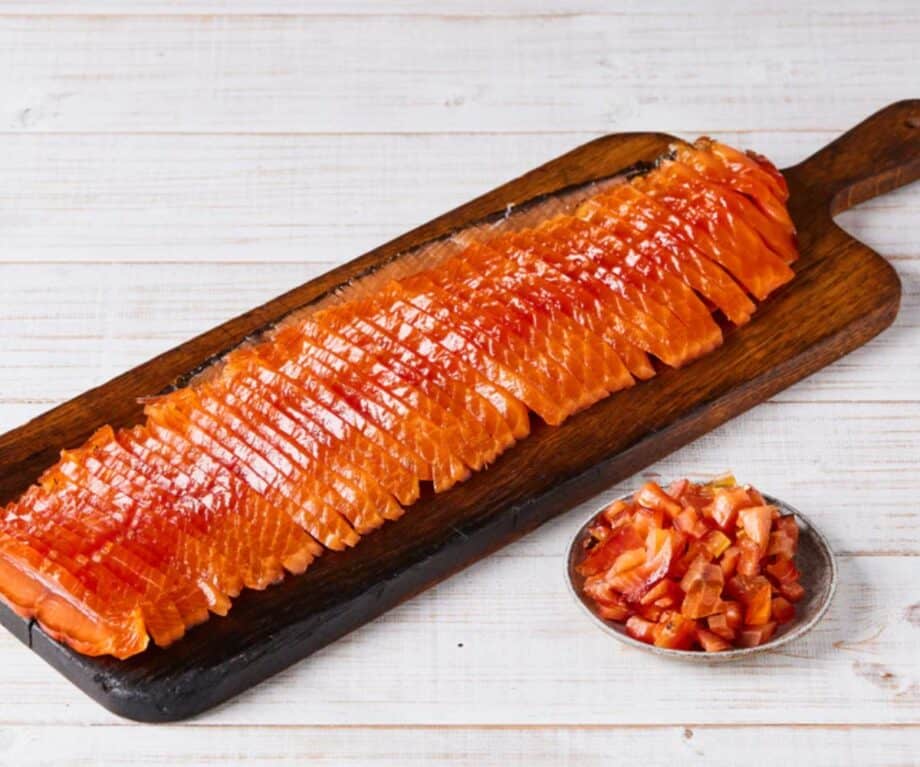 This is a full side of our hand crafted smoked salmon. Expertly sliced by Fire & Smoke’s sashimi slicers! They trim the side for you, saving you time and probably a little of frustration. This sliced side of salmon will be the showstopper for your Christmas table, adding that wow factor to your gathering.