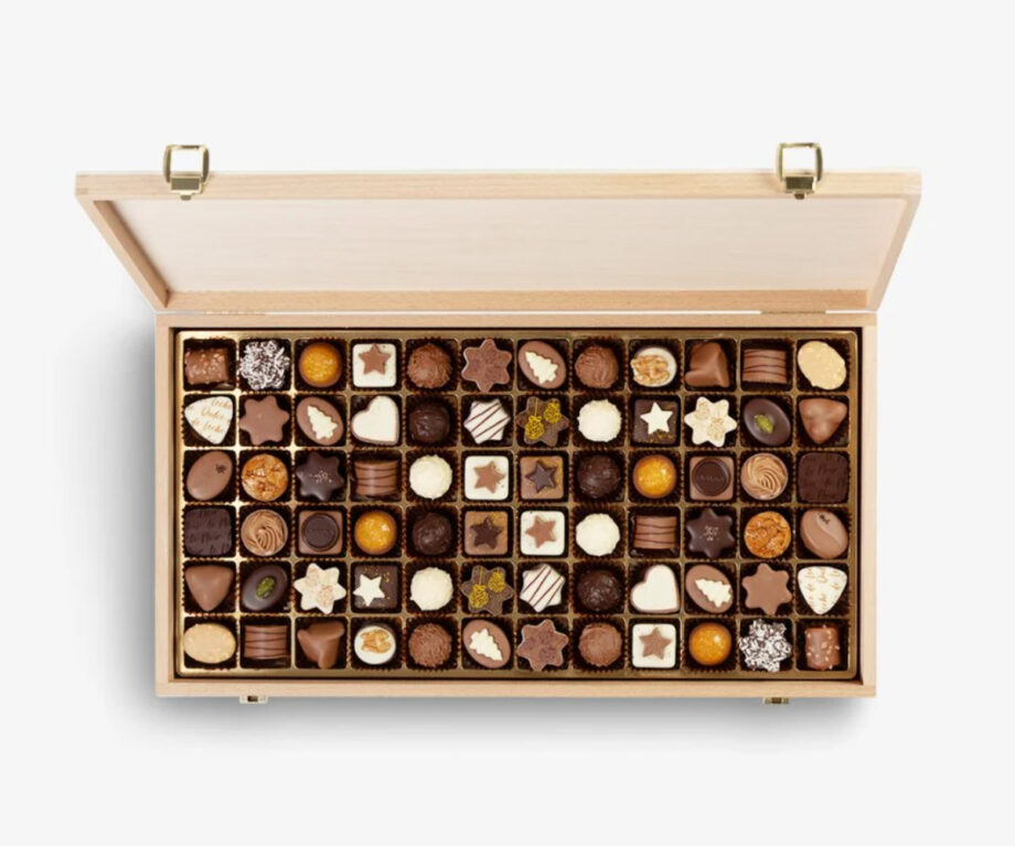 This selection of 144 exquisite Christmas pralinés created by Läderach chocolatier suisse is an unforgettable experience during Advent. Läderach has combined a selection of alcohol-free pralinés and truffles from their classic range with several Christmas-themed seasonal varieties. Presented in a wooden box, these pralinés are an eye-catcher at any holiday gathering. (1680g)