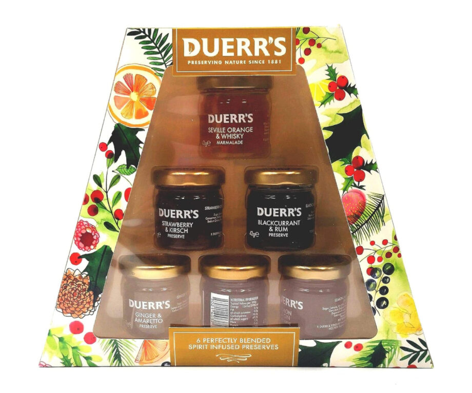 Duerr’s Christmas preserves have been perfectly blended with their favourite spirits, ideal for a leisurely breakfast or an afternoon treat in front of a roaring fire. Moments like these make Christmas that bit sweeter, so why not spread a bit of cheer with Duerr’s this year. Contents include:1 x Lemon & Gin 42g 1 x Blackberry & Gin 42g 1 x Apricot & Brandy 42g 1 x Orange & Vodka 42g 1 x Orange & Whisky 42g 1 x Strawberry & Marc de Champagne 42g.