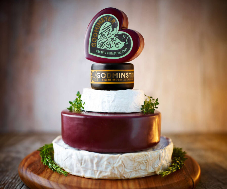 A beautiful 2.65kg tower of some of our favourite British organic cheeses, including a 1kg Organic Brie, a 1kg truckle of our burgundy waxed Godminster Vintage Organic Cheddar, a 250g Organic Brie and Godminster’s 200g Oak Smoked Vintage Organic Cheddar, all topped off with Godminster’s iconic 200g Vintage Organic Cheddar Heart. Suitable for approximately 25-35 people.