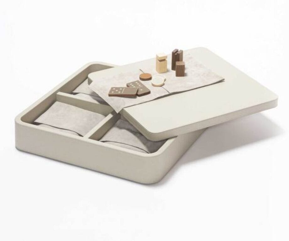 The three-game set from Giobagnara X Poltrona Frau consists of a wooden box covered in Pelle Frau® leather with an inlaid top on which checkers  and chess can be played. Four compartments, each with its own suede pochette, hold the maple and walnut chess pieces; maple and walnut checkers pieces with Pelle Frau® inlays; and walnut dominoes with laser-etched graphics.