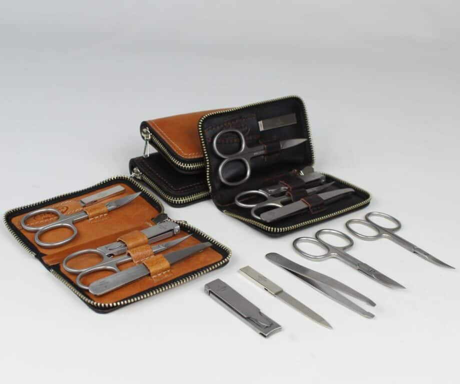 Courtesy of F. Hammann, these manicure sets come in a leather case with a metal zipper, made from vegetable tanned Alpina Bullhide, with a leather lining. The extra-flat and patented metal zipper makes the set very slim and pleasantly soft, whilst the set includes Eschenburg utensils made from stainless steel: a nail file, nail scissors, extra slim nail clippers, cuticle scissors and tweezers.