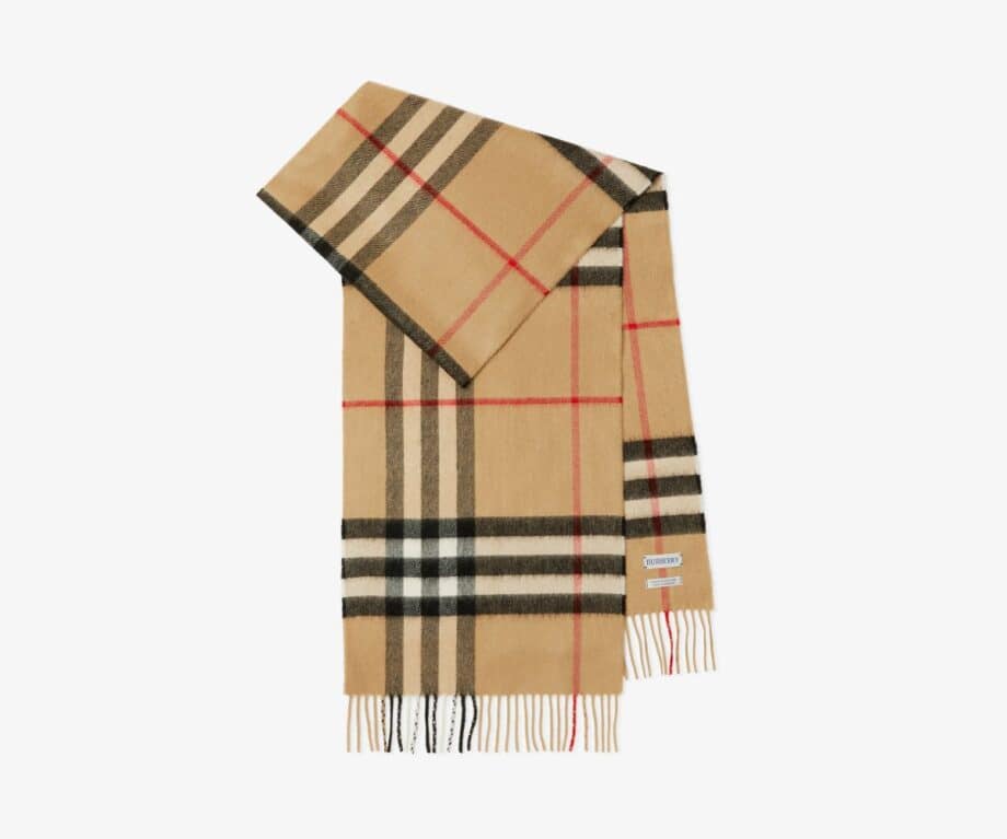 The iconic Burberry Check cashmere scarf, made in Scotland at a mill founded in 1797. Woven on traditional looms, the scarf takes more than 30 steps to complete. The fabric is washed in local spring water and brushed with teasels – dried flowers that are drawn along the surface of the cashmere to ’raise’ the cloth, creating a natural lustre and ultra-soft finish.