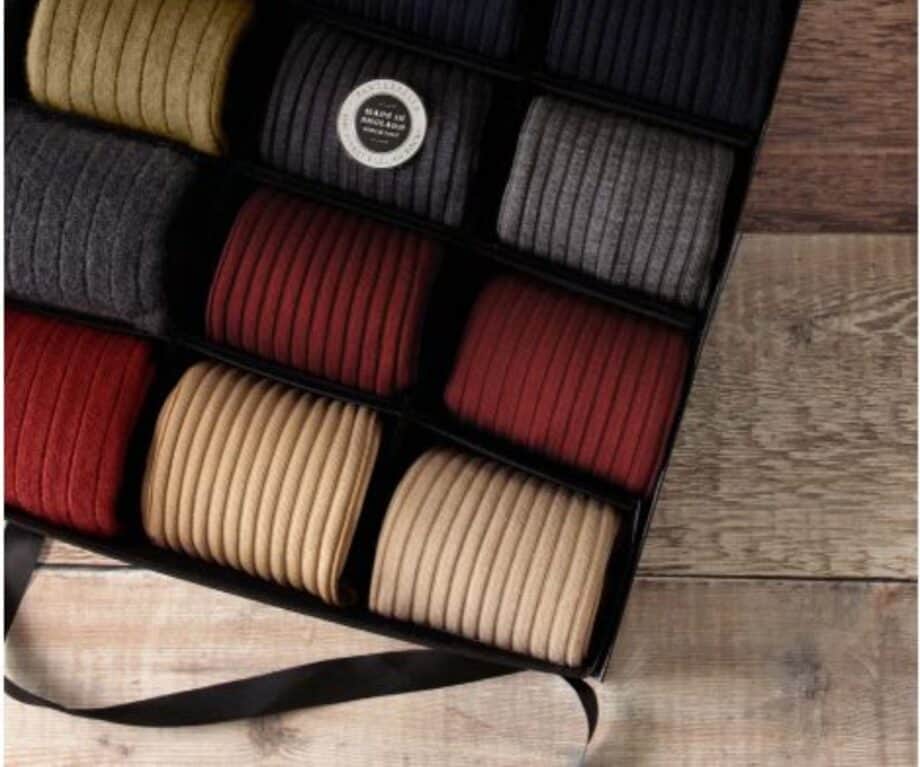 The perfect gift for the discerning gentleman. This luxury, velvet-lined gift box contains 5 pairs of ‘Waddington’ cashmere socks (in Black, Navy, Dark Charcoal, Camel and Winter Berry), 5 pairs of ‘Laburnum’ merino wool socks (in Black, Navy, Mid Grey, Light Khaki and Wine), and 5 pairs of ‘Danvers’ fil d’Ecosse socks (in Black, Navy, Dark Grey, Khaki and Burgundy), three of Pantherella‘s most popular ranges. The deep lid is subtly debossed with the Pantherella logo, and is also velvet lined, highlighting the unrivalled quality and luxury of Pantherella.