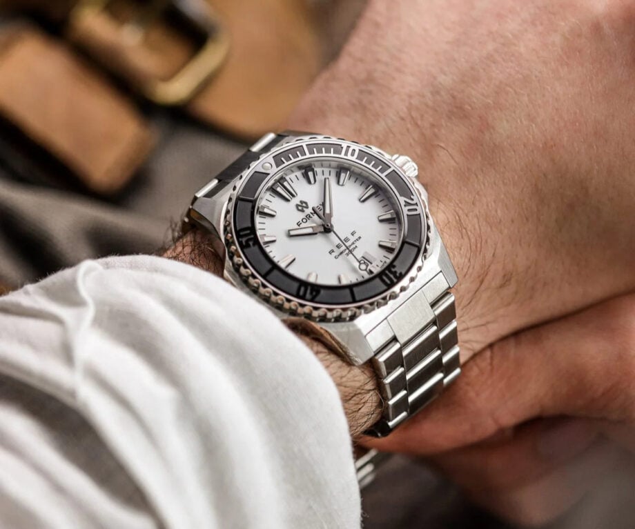 The striking 42mm Formex REEF diver has a highly distinctive stainless-steel case which provides both deep dive security and aesthetic symmetry. A double gasket protects the crown, and the watch is fully tested to 300m of water resistance. Mirror polished bevels and brushed surfaces throughout the design create a pleasing balance between elegance and the brand’s high-octane spirit.