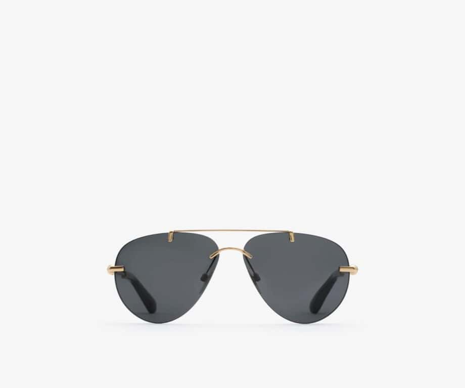 This pair of Burberry aviator sunglasses is made in Italy from metal, with acetate temple tips. The rimless lenses are linked by a brow bar and slender temples, subtly engraved with the Burberry logo, Equestrian Knight Design, rook chess piece and rose hallmarks are combined with scratch-resistant dark grey lenses and 100% UV protection. The shades also come witha hard leather clase and cleaning cloth.