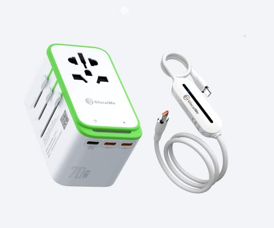 Let GlocalMe‘s Four-in-One Universal Travel Adapter and 3-in-1 Charging Cable take you on a convenient journey. This bundle includes a RoamPlug and a Unicord. Say goodbye to lugging around multiple adapters and unsecured public WiFi, and travel smarter and lighter with just one plug for all your tech.