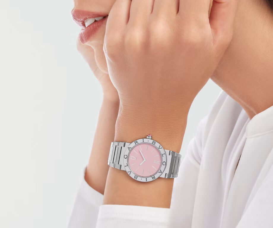 The BVLGARI BVLGARI watch is from a limited edition of 350 pieces. It features a stainless steel case and bezel engraved with double logo, polished and satin-brushed stainless steel bracelet and pink lacquered dial. It is water-resistant up to 30 metres.