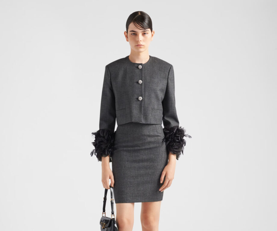Prada plays with juxtaposition to create this slate-grey jacket. Spun from wool, it boasts a sharp, structured cut contrasted with delicate detailing in crystal-encrusted buttons and fluttery feather and fabric petal trim at the cuffs, balancing strong lines with soft embellishment.
