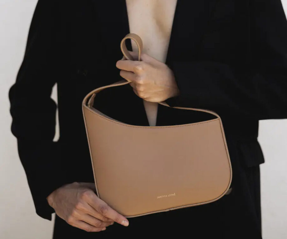 Lowe from Janessa Leoné is expertly crafted from regenerative leather, featuring a gold foil embossed logo, gold zipper closure, cotton lining with a leather pocket, and an elegantly structured asymmetrical body, making it the ideal accessory to elevate your everyday look.