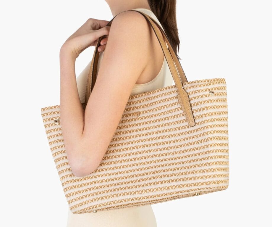 This soft mid-size tote from Eric Javitts made of stitched grosgrain alternating with Squishee® straw braid is a new signature classic. You can load it up fearlessly but when you don’t have much to carry and desire a more streamlined silhouette, snap the side gussets closed. The roomy outside zipper pocket on the reverse gives easy access to sunglasses, travel documents, or a parking stub. Other features include a magnetic snap closure, bottom feet, and shoulder-length calf leather handles.