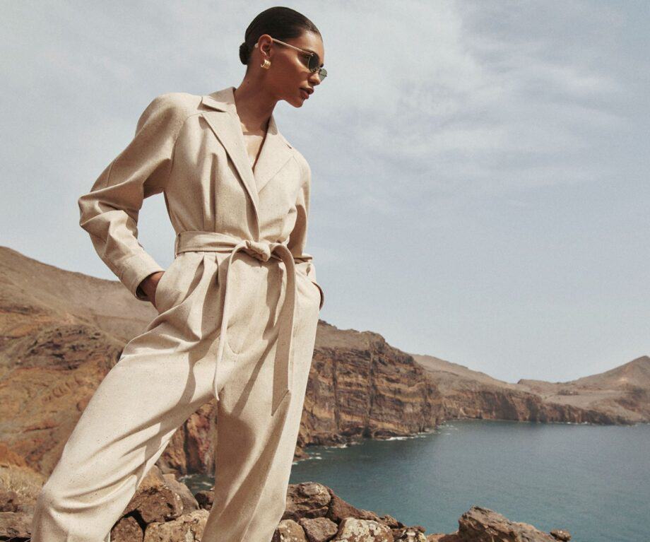 The Natura Melange Jumpsuit in Natural is available from Zimmermann‘s Spring 2024 Collection, Natura. This cotton silk blend jumpsuit features a plunging neckline and straight legs, finished with front pleats and a self tie waist. It is styled here with the Zimmermann Celeste Cat Eye and Laurel Hoops.