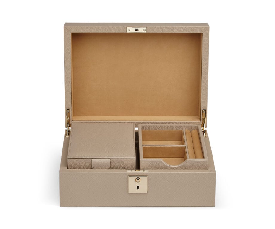 A sophisticated storage solution for your precious treasures, this Panama Jewellery Box from Smythson is crafted from luxurious cross-grain calf leather. It is an exquisite jewellery box that features a secure lock closure for added protection. Inside, discover three meticulously designed trays with multiple-sized compartments, all lined with sumptuous nubuck for a touch of opulence. The gold-toned hardware adds a timeless elegance to the piece. It is designed with the discerning traveller in mind with a built-in travel tray. This Smythson masterpiece is proudly made in Spain.