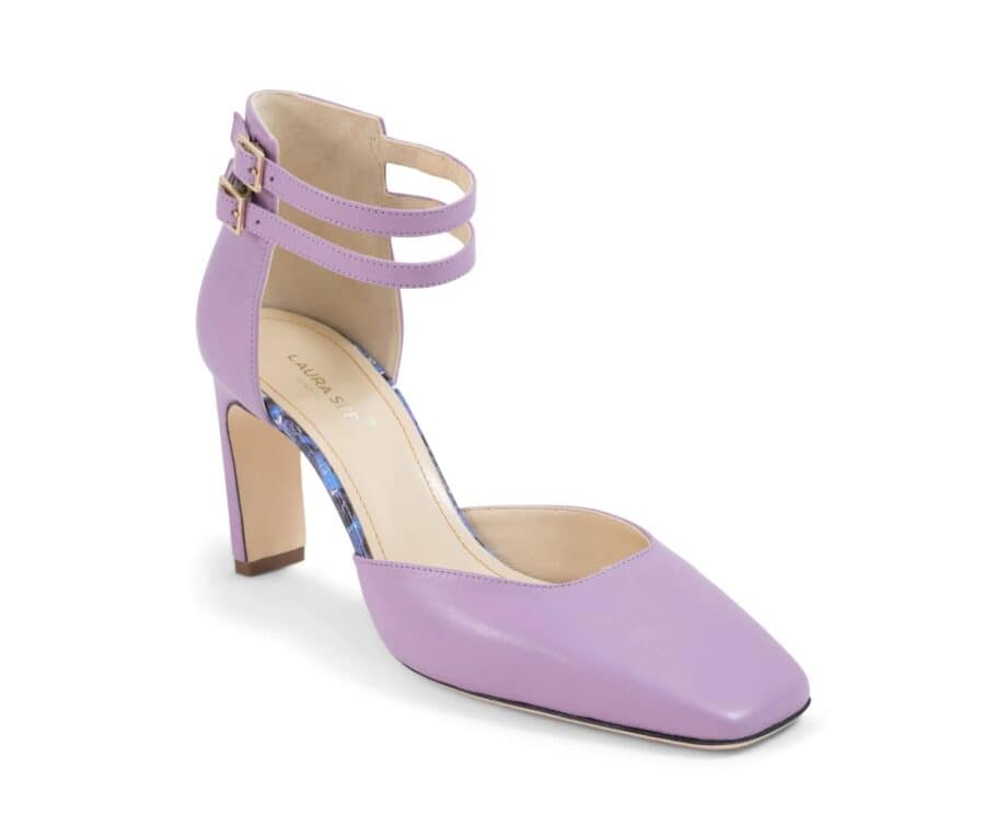 Classic pumps with a twist. This versatile square toe pump from Laura See London with double ankle strap detail, is perfect for sophisticated day wear that can be dressed up for the evening. Try the beautiful soft Italian cow leather in lavender, or a high shine grey patent which makes the midsole print ‘pop’. A square toe allows your toes to move and a ‘blocketto’ heel (block heel from the back, stiletto heel from the side) means that this style has all day comfort but will look sexy for the evening. Try with leather trousers, or a dress and patterned tights.