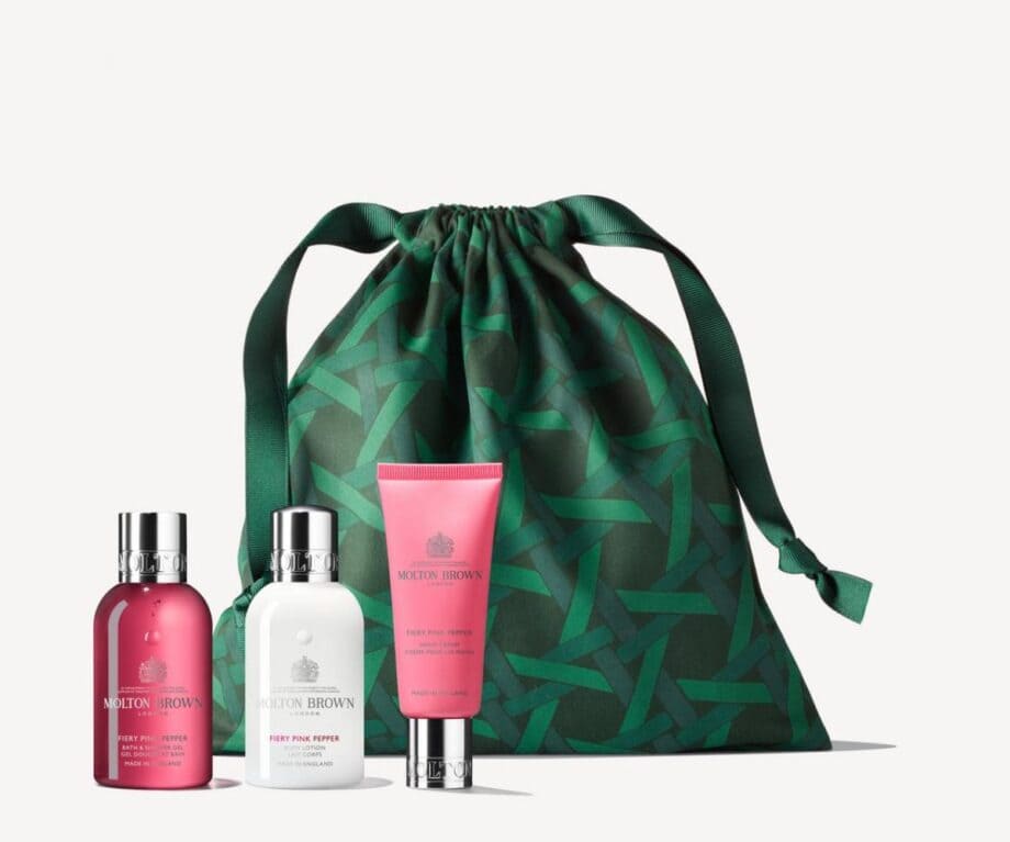 Uncover your sultry side with Molton Brown‘s iconic, bestselling Fiery Pink Pepper fragrance for Bath, Body and Hand. Discover piercing, fragrant notes of pink pepper, tangerine and cedarwood; housed in an elegant, illustrated cotton twill drawstring pouch. Includes: Fiery Pink Pepper Bath & Shower Gel 100ml; Fiery Pink Pepper Body Lotion 100ml; Fiery Pink Pepper Hand Cream 100ml; and Drawstring Travel Pouch.