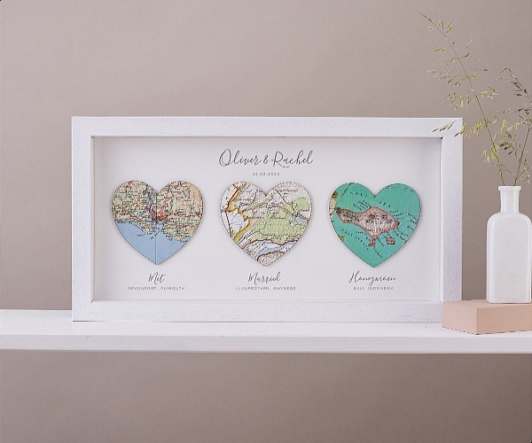 Create a beautiful custom made artwork that celebrates your favourite travel memories. Just choose three special map locations from anywhere in the world. Bombus will find them no matter how remote or unusual and handmake this personalised couples gift. Each map location heart has your choice of words printed beneath. Each piece comes beautifully gift-wrapped in tissue paper and strung with a blank map gift tag.