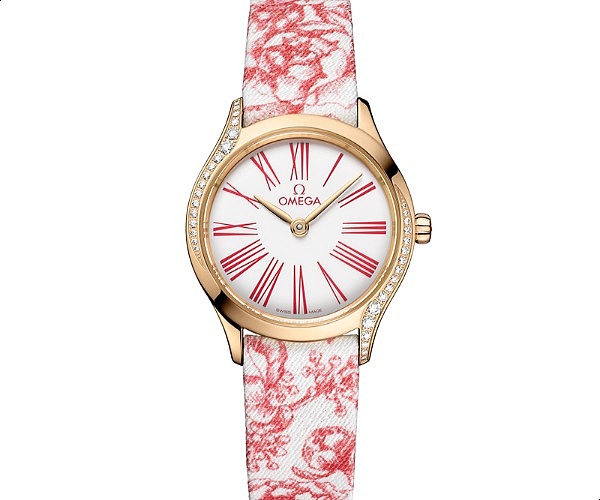 This watch is set on a unique Toile de Jouy fabric bracelet with a red floral design. Inside, the timepiece is driven by the OMEGA Calibre 4061, which sits behind a metallised sapphire crystal caseback with a mirror effect and “Her Time” pattern.