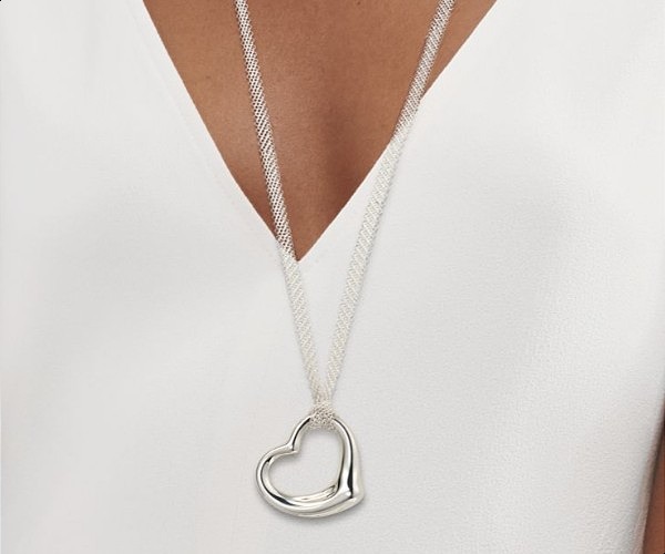 The simple, evocative shape of Elsa Peretti Open Heart designs celebrates the spirit of love. This Tiffany pendant’s organic curves create a striking contrast to a mesh chain. It is made from Sterling silver, is 36mm wide and hangs on a 30″ mesh chain. This item can be personalized, although engraved items will be delivered after February 14.