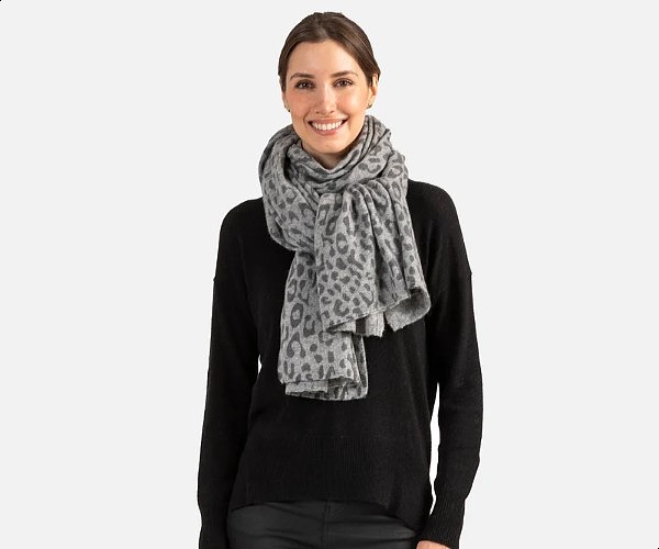 Amicale Cashmere‘s fashion-forward, tonal two-color cheetah print travel wrap is generously proportioned and incredibly cozy. Wear it as a scarf or wrap – it is great for travel and can be paired with their double layer rib slouch hat.