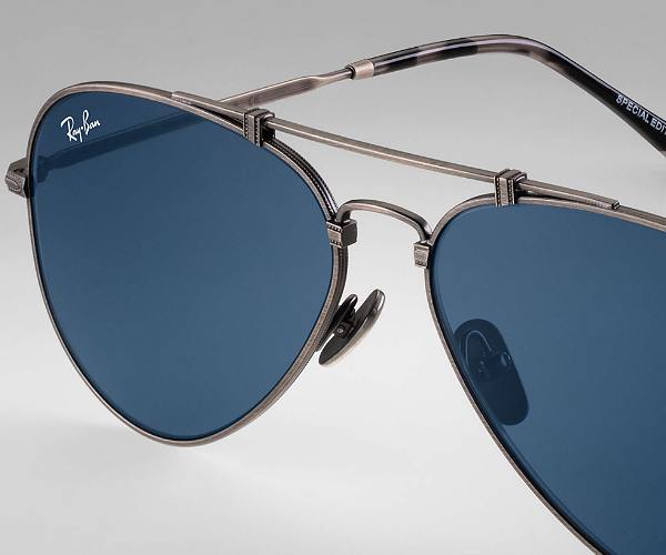 Ray-Ban Aviator defies gravity with this ultra-light Titanium frame, made in Japan. Built for those with a strong taste for excellence and precision. Featuring ultra-fine filigree engraving on both the front and temples, all with brushed finishing. Available in white gold with G15 green lenses, antique gold with gray lenses, pewter with blue lenses, shiny white gold with crystal green polarized lenses.