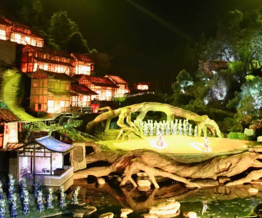 This gripping spectacular takes place in the foothills of the Tianmen Mountain in a huge set cleverly incorporating the natural elements of the area. The show re-enacts the legend surrounding the love of the Fox Fairy, a white vixen with 9 tails, for the local wood cutter. Although she is already betrothed to the Fox King, for a wood cutter she finds her true love when they meet by chance. It is a complicated tale but the audience are kept informed through comments on illuminated information boards. The strange translations are all part of the fun.