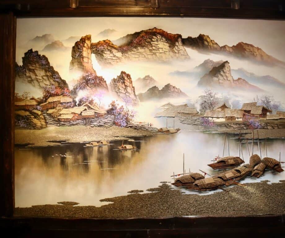 English speaking curators are on duty to explain the development of sandstone painting also referred to as “green painting” and “environmental painting”. Only they can open the heavy wooden doors that protect an exquisite scene representing the artist’s home town. Li Junsheng came from a poor family but managed to save enough money to attend the fine art school in Changsha. His desire to create art from natural materials was inspired by coloured stone decorations on the walls of houses to paint with coloured sand and stone. The popularity of these paintings inspired him to continue developing this technique, moving on from landscapes to portraits and abstract art. His techniques are taught at the Junsheng Art Academy and the Sandstone Painting Gallery opened in 2001. Visitors can take photos of the pictures displayed on the ground floor as a souvenir of their visit. Photography is not allowed on the upper floors but the art displayed here is for sale.