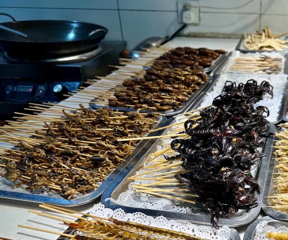 The entire length of this street is peppered with small stalls laden with delicacies enjoyed by the local population including the cooked, flattened carcases of ducks a popular local delicacy. Branching off the main thoroughfare a shabby alley hung with red Chinese lanterns leads into a traditional Chinese food market. On display here are skewers of every insect imaginable from large scorpions to small mealy worms. If bugs are not appealing there is also a huge variety of skewered fresh vegetables including local favourites like sliced lotus root and baby Asian cucumbers.