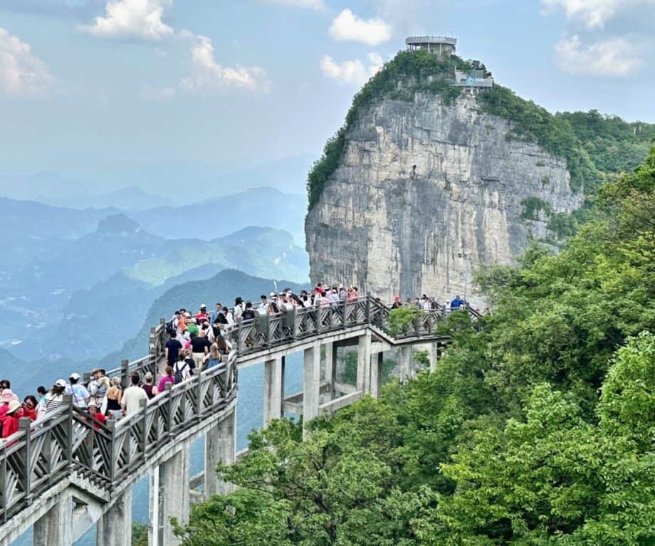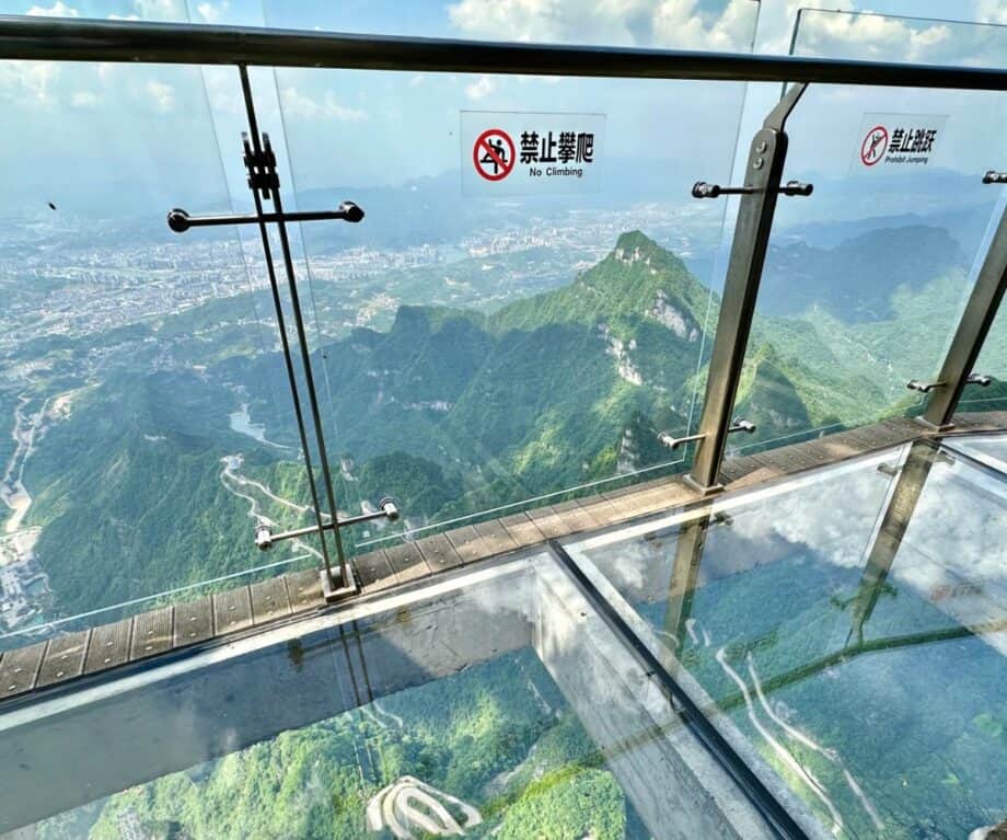 Walkways from the top of this mountain lead to the start of the glass walkway. It juts out from a sheer cliff face, nearly 1500 metres above the valley below. Prior to stepping on to the glass panes that offer wonderful views of the scenery below, visitors have to cover their shoes with the cloth slip-ons provided to protect the glass. This sturdy construction is a thrilling way to enjoy the spectacular scenery surrounding the Tianmen Mountain.