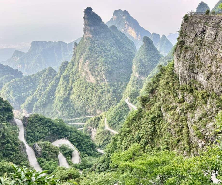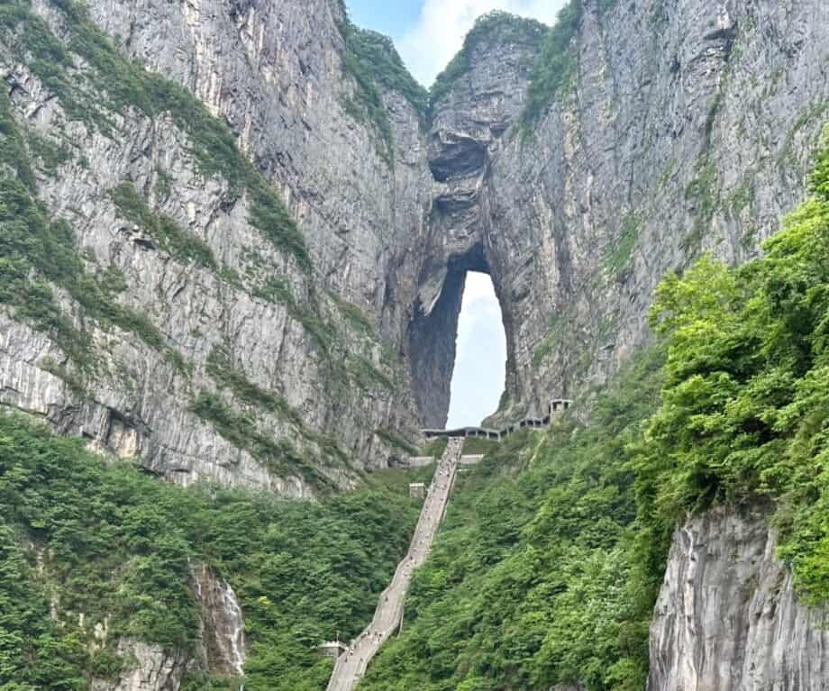 The Heaven-Linking Avenue with 99 acute turns symbolizing the nine palaces of Heaven snakes across the valley below. Its zigzag turns are impressive and offer an alternative route to ascend the Tianmen mountain using the park’s shuttle bus service. But finally, all paths lead to the Tianmen Cave. But an easier alternative is a series of twelve escalators. At the bottom of the seventh escalator visitors can walk out on to the platform below the Heavenly Gate a large opening in the Tianmen Mountain. There are two alternative methods to descend to the square below – a steep stone staircase of 999 steps or the last five escalators.