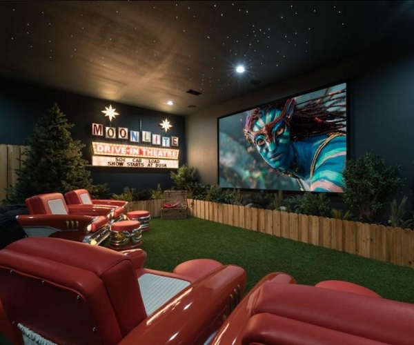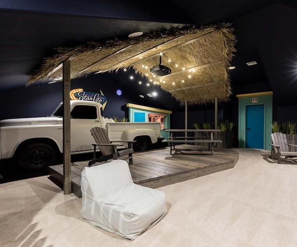 Once everyone has agreed on which bed they plan to sleep in, it’s time to take a look at the impressive social areas, which include an indoor basketball court and a fully functional fitness room. On the second floor, there is also a cocktail lounge where the adults can escape and find some peace. Here you can also access the balcony, which is the perfect place to enjoy your drink as you relax in the hammock. There is very little chance of being disturbed by the children once they find the games room. It is a captivating and delightful fort-inspired area with several arcade games, a slide, air hockey, and plenty of other activities. You can also relax around the private swimming pool or enjoy a movie in the drive-in-themed area, which includes the back of a pick-up truck as luxury seating. But don’t worry; there are plenty more seats for everyone to get comfortable and enjoy the screening.