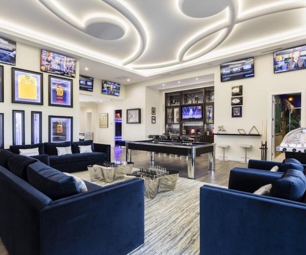 What stands out in this mansion is the care and attention taken to every aspect, specifically the awesome Happy Camper theme that is sure to delight and entertain the children of the party. There are two themed rooms which feature four bunkbeds in each. In one, you will find a tent big enough to sleep in and a tree in the middle of the room. In addition, there is a fake campfire and all the essentials you would expect to find on an actual campsite, such as lanterns. The second themed room has been designed to replicate a camping lodge and has rustic-styled bunkbeds, a second faux fireplace, and if you look to the ceiling, a real canoe has been hung to create an authentic feel.