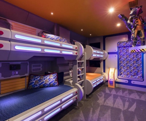 This is another excellent choice for larger family groups, as there are nine bedrooms sleeping up to 23 guests. Two of the rooms are designed with younger family members in mind, one of which features a Pocahontas theme, with Native American Indian style decoration and the other comes with a life-size statue of Rocket Raccoon in a nod to the Guardians of the Galaxy. Each children’s themed room can sleep four in a variety of bunk beds. The adults should have no problem agreeing on who has which room because all of them are gorgeous boutique-style, stacked with facilities like walk-in showers and tubs.
