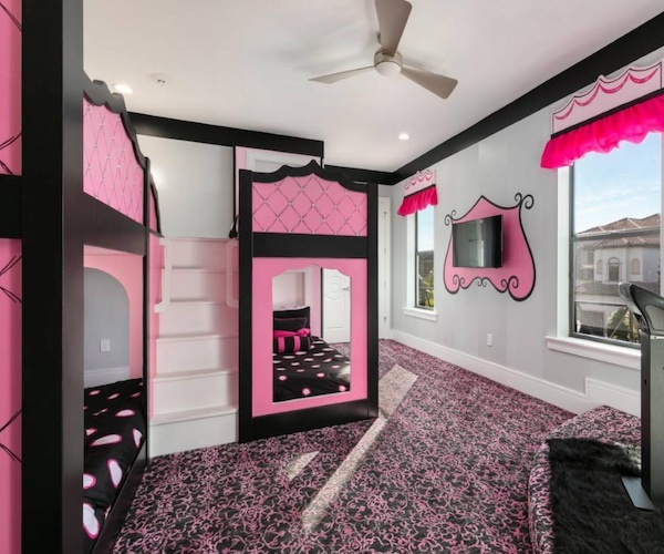 If you have a larger party, this modern and well-thought-out eight-bedroom villa can accommodate up to 20 guests. There is an elegant appeal throughout the property to appeal to the adults, but that does not take away from the fun designed to entertain the younger guests. A secret playroom provides a slide, ball pit, arcade game and mini cinema room with the perfect seats and footrests for kids. For minion fans, one of the quad bunk rooms is perfectly themed with yellow troublemakers all over the place. There is also a beautiful pink-themed pink room for the young fashionista featuring a mini stage for karaoke performances.