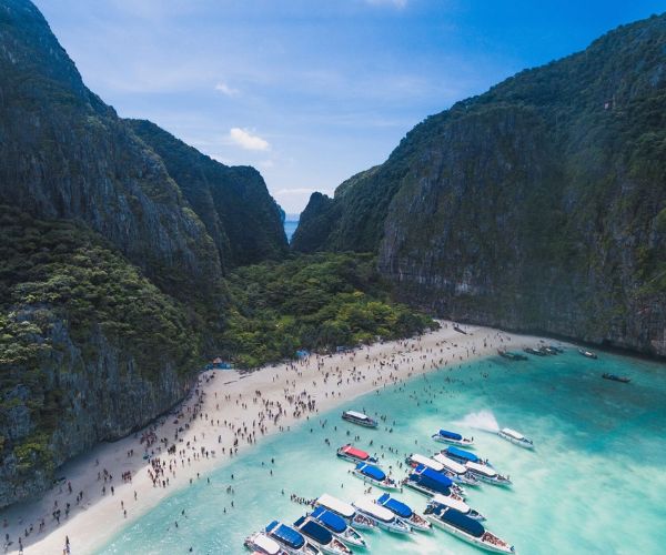 Maya Bay is located on the island of Phi Phi Leh, which is part of the Phi Phi Islands in Thailand. The beautiful beach is surrounded by towering cliffs, and its crystal-clear waters make it a popular destination for snorkeling and diving.
