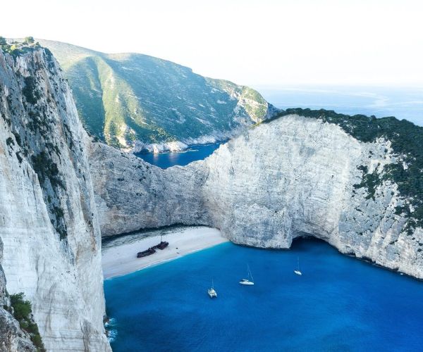 Navagio Beach is located on the Greek island of Zakynthos, and it’s one of the most photographed beaches in Greece. The beach gets its name from the old shipwreck that lies on the sand, which is a popular attraction for visitors.