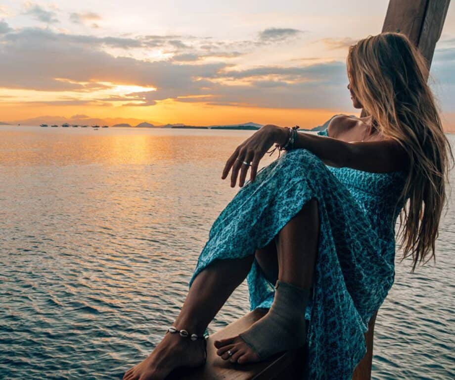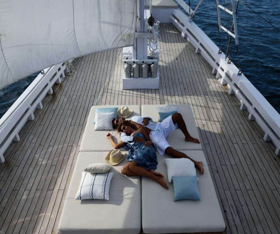 All the above-mentioned aspects of a private yacht charter are just part of the overall experience, from the luxury and comfort of the vessel to the personalization of the itinerary and the choice of destination and activities. What makes a honeymoon charter truly special is being on a boat. Exploring a secluded island, navigating from one location to the next, and jumping into turquoise waters encourage you to be fully present, engage your senses, and appreciate your surroundings with a heightened awareness of being alive. As the yacht glides gracefully through the crystal clear water, and you observe the changing landscape, a unique sense of tranquility arises that sets a yacht charter apart from any type of all-inclusive beach resort stay. Looking at the vast horizon, you automatically disconnect from stress, screens, and the never-ending noise of tasks and duties. Feeling the warmth of the sun touching your skin, the cool sea breeze in your hair, and the gentle rocking motion of the boat beneath create an environment that awakens the soul and invigorates the spirit. During these blissful moments at sea, you can really let go of distractions and embrace the love for each other.