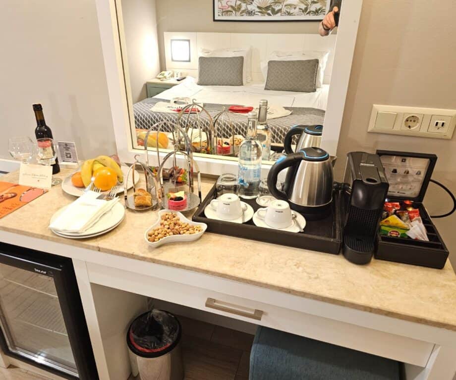 There’s a mini-bar, replenished daily, that you can help yourself to and, to greet our arrival, there was a small bottle of wine, some snacks and fresh fruit.