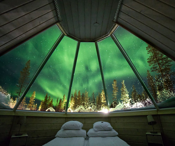 Due to minimal light pollution, the northern lights are visible as many as 200 nights a year in Finnish Lapland, the area bordering Sweden, Norway and Russia. You can witness it from your luxurious tent at Aurora Glamping or in a glass Aurora Cabin at Northern Lights Village Saariselka or Lev.