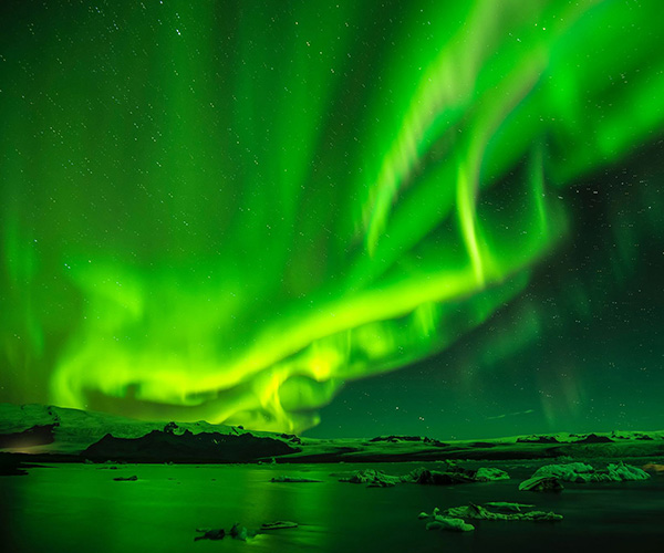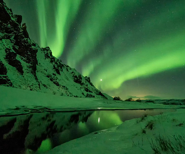 Travel from Reykjavik through Iceland’s diverse landscapes. Good places to admire the northern lights are the Snæfelsness Peninsula, Thingvellir National Park, the Jökulsárlón glacial lagoon and the black sand beach of Reynisfjara.