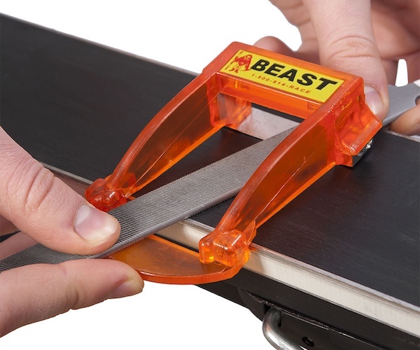 Professional ski tuners use little tools to lock the angle of the file, so it creates a precise effect. Beveling refers to taking the base and ski edge down a bit, maybe just a degree from the base. This allows the ski or board to roll easier into the turn. This should be done on both the bottom and the side edge. Tools like the BASEbeast and SideofBEAST edge bevel enable you to bevel the bottom while filing, then match the side angle to make a 90-degree angle. The result is the ski or board will ride optimally. Side beveling is often a forgotten aspect of sharpening and setting the edges.