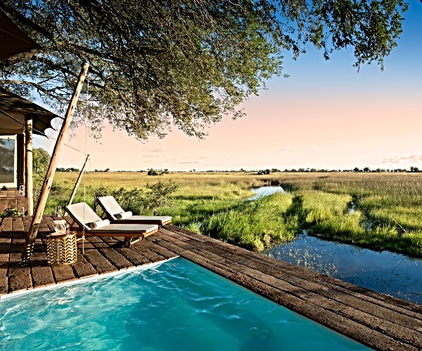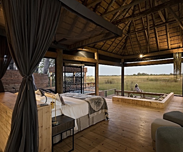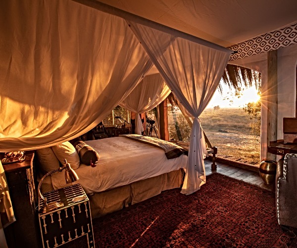 Vintage style, luxurious tented rooms, with just 6 rooms, built in the shade of fig and mangosteen trees and overlooking the Okavango flood plains. Campaign style chairs, oriental rugs, leather armchairs, canopy beds shrouded in mosquito netting and a climate controlled wine cellar, with a few hundred bottles of wine.
