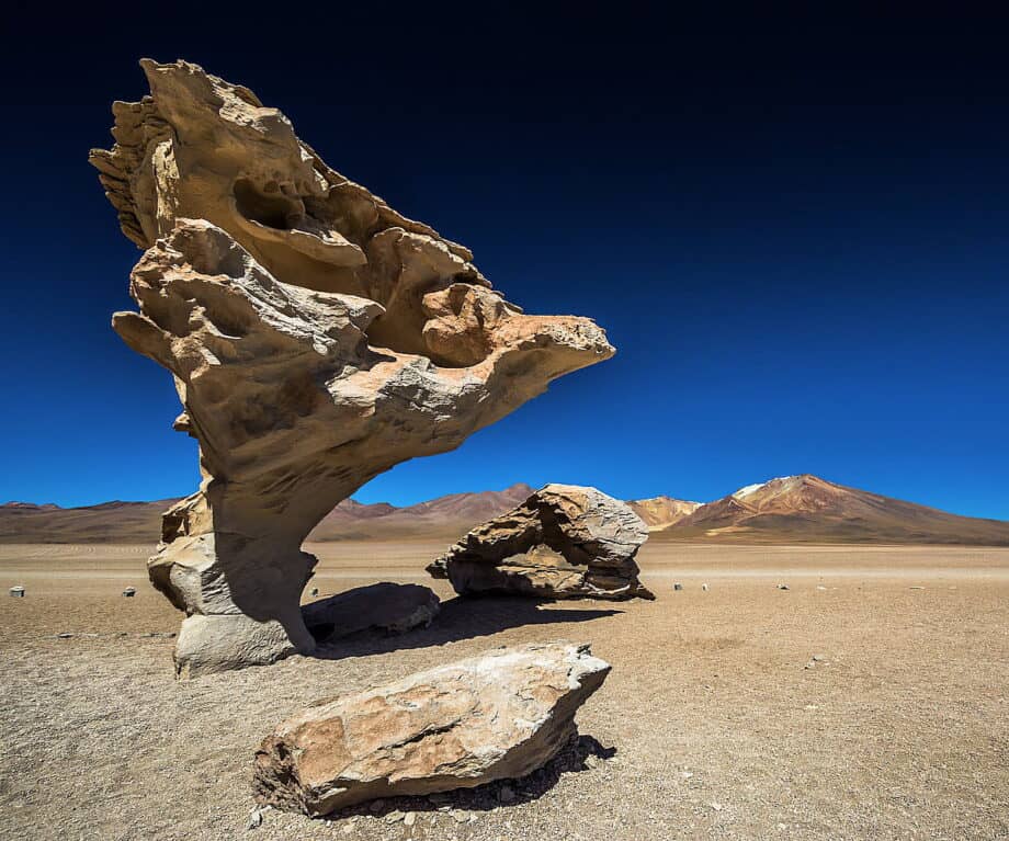 Behind it all, towering volcanoes and eerie rock formations that have been shaped over time by the unrelenting wind make for a fascinating backdrop to this unforgettable scene. Barren but beautiful, and awash with exceptional photo opportunities, the Siloli Desert’s vast dusty landscape of striking colorful vistas is a startling place to behold.