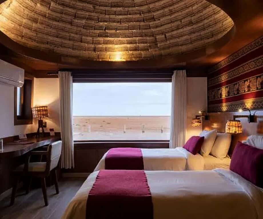 One of our favorites is the Palacio de Sal (the “Salt Palace”), a sumptuous, secluded retreat for adventure nestled at the edge of the flats. Fashioned almost entirely out of salt, the hotel welcomes you to discover one of the most mystical places on Earth. Step out onto the salt pans just meters from your door to experience a vast expanse of brilliant white as far as the eye can see. Guests can enjoy cozy rooms, gourmet dining, and even a spa – all while surrounded by the surreal beauty of the salar. Equally stunning views of the Salar de Uyuni can be taken in from every window of the hotel.