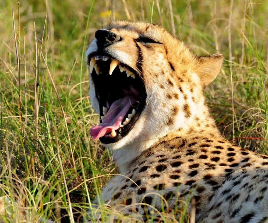 Afternoon comes, and we head out on another game drive. The distinctive roar of a lion reverberates from somewhere in the reserve. We head in the direction of the sound, one synonymous with the African bush, and after many twists and turns, and a detour past a cheetah who’s using the top of a termite mound as a lookout point, we’re rewarded with the sight of a thick-maned male lion patrolling his territory, and announcing his presence for all to hear. We sit and watch for a while, transfixed by the size and strength of this powerful predator.