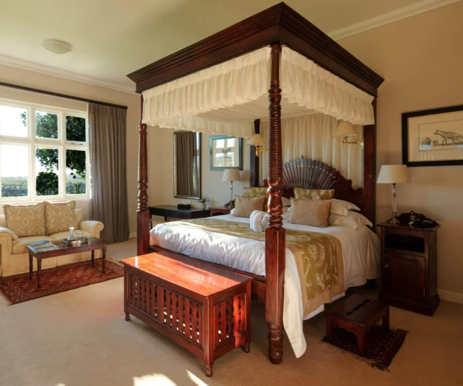 The main building retains a classic farmhouse feel, with wide verandas, stone walls, and open lawns. The outdoor fire pit and shaded terrace invite sun-soaked lunches and quiet evenings sitting out under the stars, while the swimming pool and gym give you a place to stretch your body between game drives. What sets the lodge apart, however, is not just its design or décor, but rather its direct link to the wider Shamwari landscape and the conservation journey that began here.