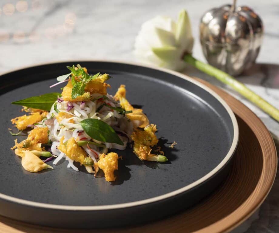 Dining at 1932 is not to be missed when staying at Raffles Grand Hotel d’Angkor Siem Reap. The elegant fine dining restaurant offers a culinary journey when choosing one of four meticulously crafted menus, each a homage to a chosen decade of rich and diverse Cambodian history. Each of these fine dining tasting menus features local seasonal produce, no more so than the perfectly plant based ‘Grand Renaissance’ menu which celebrates the 1950s, a decade during which Cambodia gained independence. Our meal was a sublime blend of culinary creativity and Khmer flavours, traditional Cambodian dishes elevated to suit the environment, and adapted to make them vegan. The smoky eggplant atop our Khmer rice cakes, the light, refreshing and re imagined ‘nom banh chok’, the rich and and delightfully creamy amok, and the trio of palm sugar filled ‘nom pla ai’ each took us on a delightful journey though the history of Cambodian cuisine.