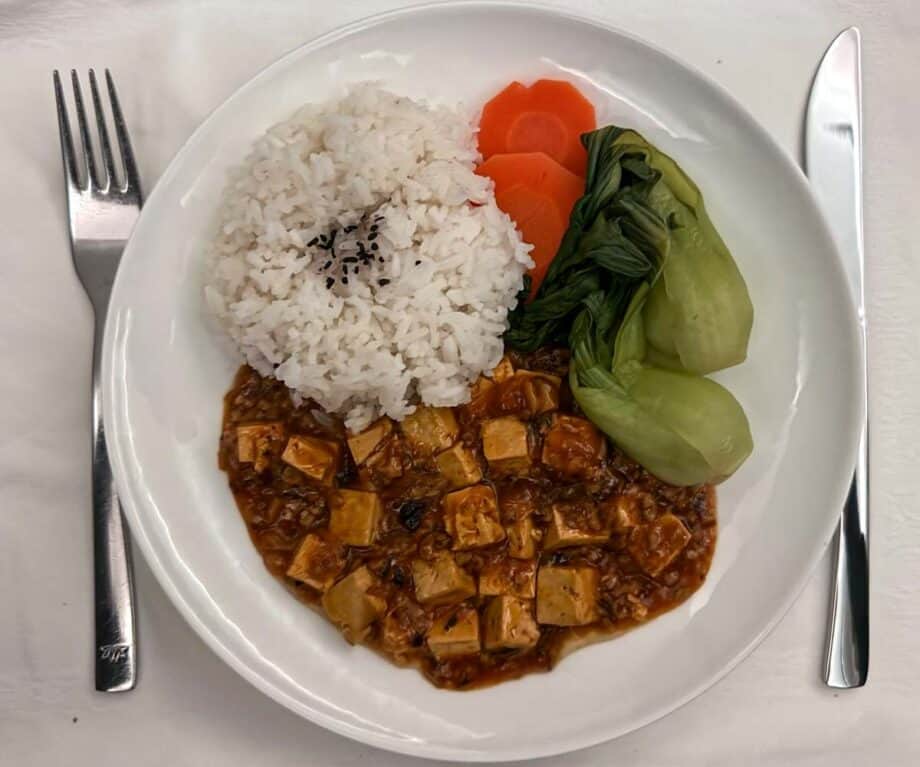 Everything was clearly labelled, which made it easy to realise there was very little for us to choose from. Salad, roast potatoes, cauliflower with black fungus and goji berries were the only items that we could have eaten with steamed white rice. There was delicious-looking marinated tofu but the sauce was not vegan, which was a classic case of ‘nearly, but not quite’. Our flight was delayed, which provided us with another option as new dishes were introduced to the buffet, including a black-eyed peas curry and kailan with fried garlic, which both paired perfectly with the aforementioned steamed white rice, making for a tasty and nutritious pre-flight bite whilst waiting for our delayed departure.